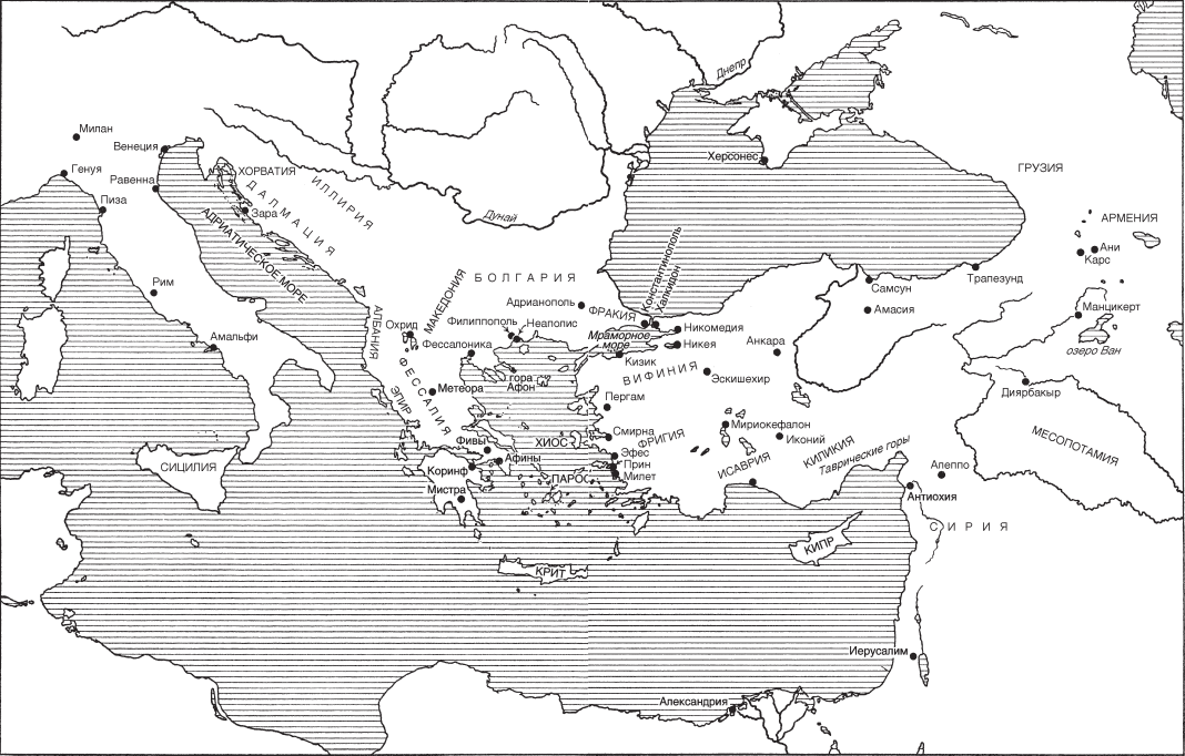 Несмотря на то что границы Византийской империи значительно менялись, интересующую нас территорию, так называемый византийский мир, можно установить с достаточной точностью (рис. 1). На севере ее границами были Черное море и Дунай. За ними господство Византии никогда не распространялось, однако политические и торговые отношения развивались и за их пределами. На западе естественным барьером служили горы восточного побережья Адриатики, которые препятствовали культурным контактам гораздо действеннее, чем море, находившееся еще дальше к западу. На востоке и юго-востоке находились горы, которые и сейчас отделяют Турцию от Сирии, Месопотамии и Персии. И хотя Сирия и Палестина были важными частями империи, горы эти создавали четко обозначенную естественную границу (на протяжении интересующей нас эпохи) так же, как сегодня они отделяют турецкие земли от арабских и иранских. Точно так же можно четко разделить Византию и Грузию с Арменией на северо-востоке. Несмотря на то что Армения порой подпадала под владычество Византии, эти страны были в той же мере частью кавказского мира, как и так называемая малая Армения в Киликии, игравшей значительную роль в XH веке. Между тем она всегда являлась признанной частью византийского мира.