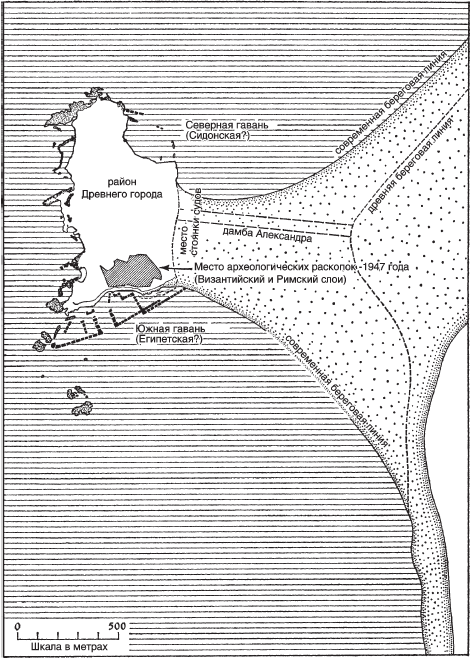 Рис. 2. План Тира с древними гаванями и дамбой Александра, соединившей остров с материком