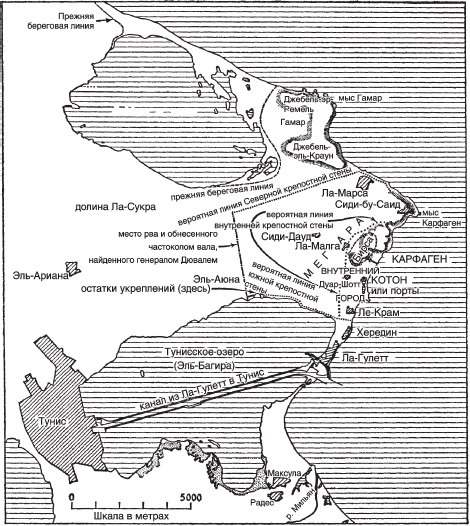 Согласно древним источникам, во время 3-й Пунической войны город был окружен стеной длиной в 21 милю. Если крепостная стена тянулась к северу через самую узкую часть перешейка, затем на восток к берегу севернее Ла-Марсы и назад вдоль морского побережья через Сидибу-Саид и Ле-Крам (рис. 3), то этим данным можно доверять. К тому же есть и вещественные доказательства: 1) фундаменты в море рядом с берегом от Бордж-Джедид почти до прямоугольной лагуны; 2) рвы, ограды и другие свидетельства, найденные в 1949 году там, где древняя стена пересекала перешеек, и 3) остатки стены на берегу озера в 13 – 16 футов толщиной в двух милях к западу от Ле-Крама. Судя по типу камней, их размерам и кладке, эти укрепления должны быть пуническими или ранними римскими, но поскольку римский Карфаген был укреплен лишь в V веке н. э., то мы можем считать их пуническими.
