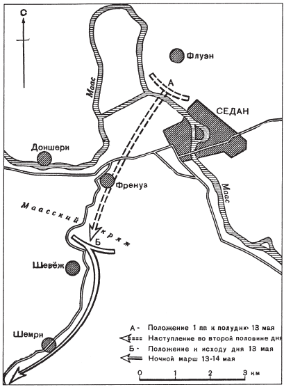 Я располагаю описанием этого сражения, сделанным командующим 1-м стрелковым полком 1-й танковой дивизии полковником Бальком[19]. Вечером 12 мая его полк подошел к Маасу южнее Флуэна и остановился, готовый к атаке. Все офицеры и солдаты знали свою задачу; уже несколько месяцев они отрабатывали форсирование реки и изучали карты и аэрофотоснимки местности. Наша разведка добыла точные сведения о французской обороне вплоть до отдельных укрепленных пунктов.