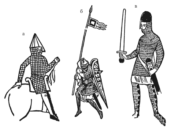 Скульптуры, раскрашенные рукописи и печати показывают, что доспехи, подобные изображенным на гобелене из Байё, были распространены по всей Европе того времени (рис. 1, а). К XI в. распространился и другой тип кольчуги, с длинными, до самых запястий рукавами (рис. 1, а и в). Но все подобные доспехи так и не вытеснили старую форму (рис. 1, б). Приблизительно с 1100 г., до всеобщего введения сюркота в начале XIII в., из-под кольчужных рубах выглядывали края нижней одежды, часто с развевающимися длинными полами (рис. 1, б и в). Во всем остальном, за исключением некоторых мелких деталей, воинская экипировка оставалась практически неизменной от времени создания гобелена из Байё (после 1066 г.) до второй половины XII в.