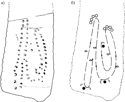 Рис. 4: а) костяная пластина с рисунками из пещеры Бланшард (Дордонье) (на основе фотографии); б) схематическая репрезентация нотации 2 1/4 лунного месяца, прослеженная на кости из Бланшарда по идее Маршака