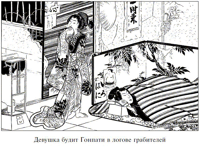 Договорившись обо всем, девушка вышла из его комнаты. Гонпати же лежал без сна, сдерживая дыхание и прислушиваясь. И когда грабители бесшумно проникли в его комнату, полагая, что Гонпати крепко спит, он разрубил мечом первого вошедшего к нему, и тот упал замертво к его ногам. Другие девять, видя это, набросились на него с мечами, но Гонпати, отчаянно сопротивляясь, в конце концов поубивал их всех. Избавившись таким образов от врагов, он вышел из дома и позвал девушку, которая с готовностью прибежала под его защиту, и они вместе отправились в путешествие в провинцию Микава, где жил ее отец. Когда они добрались до Микавы, Гонпати привел девушку в дом старика и рассказал ему, как его дочь, когда он оказался в логове грабителей, пришла к нему в час смертельной опасности и спасла ему жизнь из жалости, и как он, в свою очередь, спас ее от рабства и привел назад домой. Старики, увидев, что дочь, которую они потеряли, вернулась к ним, были вне себя от радости и даже прослезились от счастья. А в благодарность они настояли, чтобы Гонпати остался с ними, приготовили в его честь пиршество и радушно угощали гостя. Но их дочь, которая влюбилась в Гонпати за его красоту и рыцарскую удаль, все дни напролет думала только о нем одном. Однако молодой человек, несмотря на доброту старого купца, который хотел было усыновить его и постарался убедить дать на это согласие, рвался в Эдо, мечтая поступить на службу к какому-нибудь благородному господину офицером, поэтому, вопреки просьбам отца и сладким речам дочери, стал готовиться в путь. А старый купец, видя, что его не свернешь с дороги, вручил ему прощальный подарок в виде двух унций серебра и, печалясь, распрощался с ним.