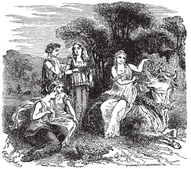 Он поселился среди гор Северной Греции, часто совершал вылазки на землю, появляясь в разных обликах, испытал множество чудесных и удивительных приключений. Во время одного из путешествий он добрался до Египта, где были владения Агенора, и увидел его прекрасную дочь Европу. Он сразу решил сделать ее своей невестой; для этой цели принял облик статного и красивого быка и в таком виде присоединился к стадам Агенора. Там его увидела Европа. Она пленилась его красотой; сочтя его нрав мягким и покладистым, приблизилась к нему, начала гладить, показывать Юпитеру свое восхищение и расположение. В конце концов с помощью магических чар он заставил Европу забраться к себе на спину и пустился бежать. Он домчался со своей ношей до берега моря и бросился в его волны. Переплыв море, он вышел на сушу на острове Крит и, приняв свое настоящее обличье, сделал принцессу своей невестой.