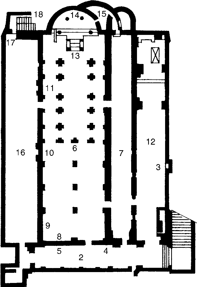 Рис. 2. План нижнего этажа церкви Святого Клемента: 1 – лестница – вход на этот этаж; 2 – нартекс; 3 – фреска «Мадонна»; 4 – фреска «Чудо»; 5 – фреска «Претворение»; 6 – подпорки, сооруженные с 1860 по 1870 год; 7 – продолжение первоначального нефа – стена-подпорка 1100 года; 8 – фреска «Вознесение» (?); 9 – фреска «Распятие»; 10 – фреска «Святой Алексей»; 11 – фреска; 12 – северный придел; 13 – алтарь; 14 – апсида-подпорка 1100 года; 15 – первоначальная апсида; 16 – южный придел; 17 – гробница святого Кирилла (?); 18 – лестница, ведущая на самый нижний уровень