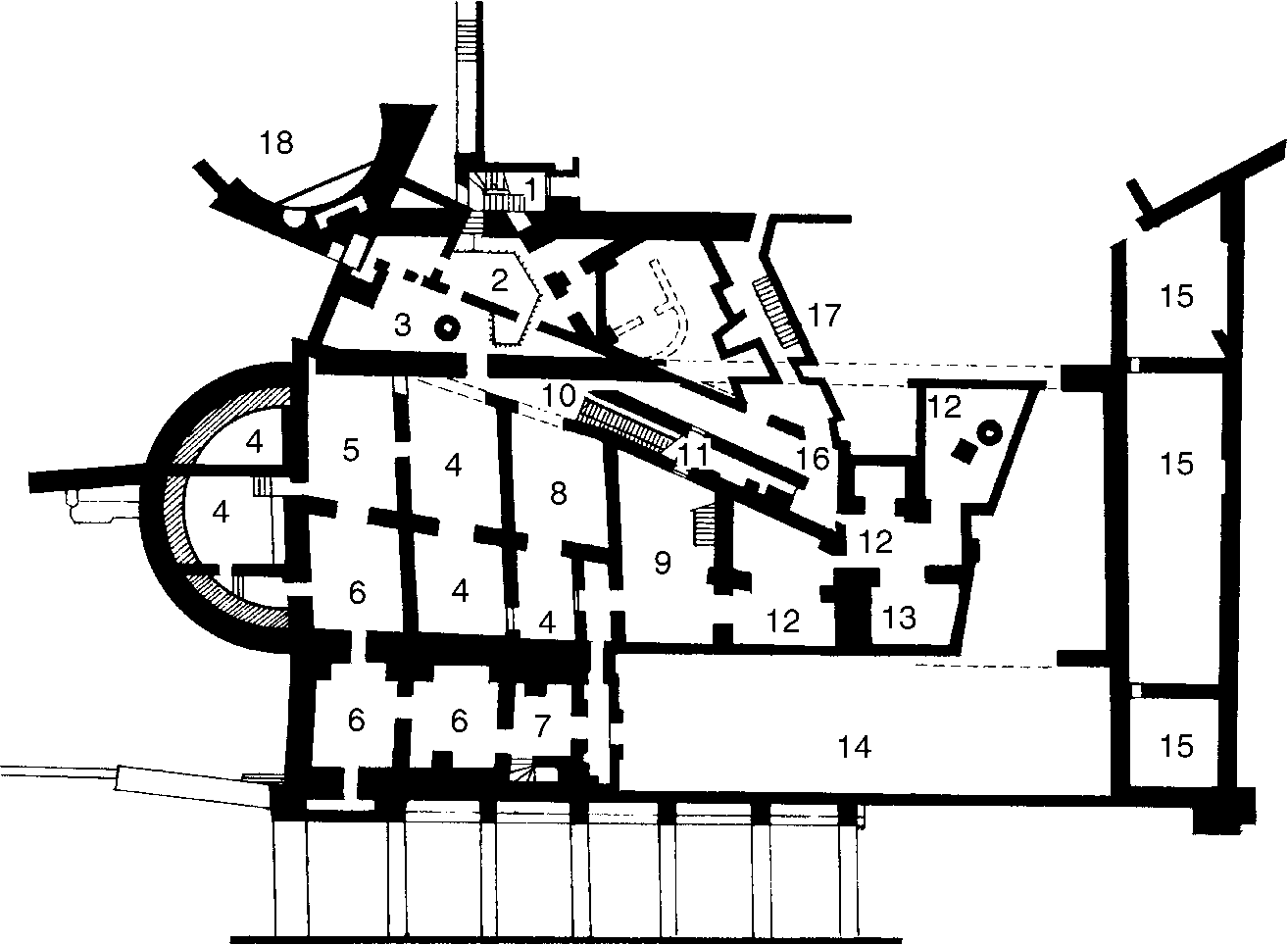 Рис. 4. План раскопок под церковью Святых Джованни и Паоло: 1 – вход на территорию раскопок; 2 – сточная труба и лестница, сооруженная в IV и V веках; 3 – нимфеум с фреской и колодец; 4 – комнаты римского дома; 5 – комната с фресками; 6 – комнаты, назначение которых не установлено; 7 – остатки средневековой живописи; 8 – комната с фреской «Орант»; 9 – комната, из которой можно пройти в конфессио; 10 – лестница, ведущая в конфессио; 11 – проход, из которого видны предполагаемые гробницы мучеников; 12 – комнаты, еще до конца не исследованные; 13 – винный погреб; 14 – не раскопано; 15 – территория под нартексом с остатками дома, гробницами (после 1000 года н.э.) и фундаментом базилики; 16 – коридор (который во II веке вел на открытый воздух); 17 – вход в малые бани; 18 – остатки древних сооружений за пределами церкви