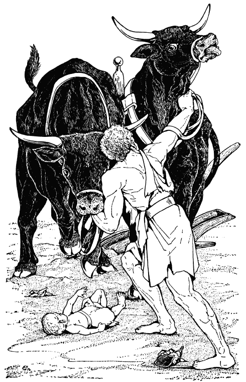 Паламед вышел из себя. Одним прыжком он очутился возле Пенелопы, выхватил у нее младенца и бросил его на песок прямо под копыта волов. Лукавый царь, который ничего не замечал в течение двух дней, вдруг выдал себя целиком и полностью. Он со всей силы развернул плуг, а затем рванулся к головам пашущих волов и выхватил своего сына прямо из-под грозных копыт. Потом он повернулся к Паламеду и одним ударом сбил его с ног.