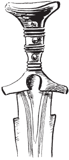 Бронзовые мечи из Скандинавии следует рассматривать как отдельную группу, поскольку они резко отличаются от других своим превосходнейшим качеством и характерной формой. Они более прямо восходят к минойско-микенским прототипам, чем какие-либо другие мечи бронзового века. В то время скандинавы имели самые близкие культурные и торговые связи с эгейцами, и фактически самые ранние образцы бронзовых мечей, появившиеся на севере, могли быть завезены с юга[1]. Независимо от того, так это или нет, рукояти датских мечей ранней части этого периода обладают характеристиками, присущими минойским мечам, а все лезвия (которые обычно бывают длинными и очень тонкими) имеют, как и микенские, жесткое ребро, идущее строго по центральной линии клинка. На севере не находили ничего похожего на ирландские рапиры, но, судя по всему, практика фехтования была сходной, поскольку элегантные, длинные и узкие клинки этих ранних мечей и прекрасно выраженные центральные ребра ясно указывают на то, что они были предназначены для нанесения колющих ударов. Как и ирландские рапиры, эти мечи уступили место другим образцам, клинки которых были ближе к универсальной листовидной форме, а рукояти делались не из твердой литой бронзы, а, подобно обычным европейским типам, состояли из костяных или деревянных пластин, прикрепленных заклепками к очень прочному, расширяющемуся на конце хвостовику. Ближе к концу этого срединного периода мы обнаруживаем массивные клинки, в которых едва ли прослеживается сходство с листовидными образцами: их кромки идут практически параллельно, а кончики, хотя и соразмерные, никак нельзя назвать острыми. Техника исполнения по-прежнему достойна восхищения, но стала гораздо проще: мечи перестают так мастерски украшать и тщательно разрабатывать, как это делалось в более ранний период. Они столь же очевидно предназначены для нанесения рубящих ударов, как их предшественники – для фехтования.