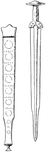 В действительности гальштаттские мечи принадлежат к раннему железному веку, и, хотя первые изделия этой культуры были отлиты из бронзы, будет более правильно перейти к их рассмотрению в следующей главе. «Язык Карпа» был крупным оружием с любопытной формой лезвия: его края шли параллельно друг другу на две трети длины, а затем резко сужались к кончику. Очень красивый меч этого типа был найден в Темзе поблизости от Кью (музей Бренфорд). Большинство из этих образцов находят в виде отдельных фрагментов, среди осколков и кусочков, которые хранят у себя любители бронзы. Очень немногие мечи сохранились целиком. По-видимому, все эти мечи составляли отдельную группу – некоторые из них обнаружены на юго-востоке Англии, другие – во Франции и Италии, но их никогда не находят в Центральной Европе или Скандинавии. На рис. 8 изображен один из них, особо интересный благодаря тому, что у него сохранилась рукоять и бронзовые ножны. Он найден в Париже, в Сене, и в настоящий момент выставлен в Музее Армии.