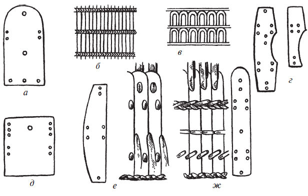 Рис. 4. Типы чешуйчатых доспехов: а – из Идалиона (Кипр), VI в. до н. э.; б – рельеф из Ниневии, 668–626 гг. до н. э.; в – рельеф из Нимруда, около 880 г. до н. э.; г – аварские, из Керчи, V в. н. э.; д – римские, из Дура-Еуропос, III в. н. э.; е – из Висбю, Готланд, около 1361 г.; ж – Тибет, лицевая сторона ременчатых чешуйчатых доспехов; задняя сторона, отдельная чешуйка