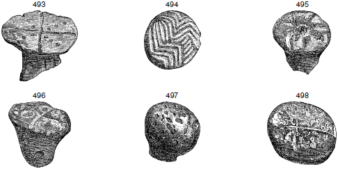 Рис. 493–498. Шесть печатей из терракоты. (7:8 натуральной величины. Найдены на глубине от 26 до 35 футов)