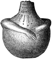 Рис. 487. Погремушка из терракоты в виде женщины; голова отсутствует. (2:3 натуральной величины. Найдена на глубине 20 футов)