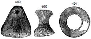 Рис. 489–491. Ручка щетки из сушеной глины, предмет из терракоты и кольцо из перламутра. (1:3 натуральной величины. Найдены на глубине от 26 до 32 футов)
