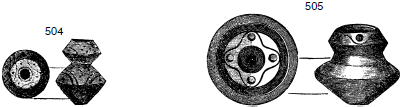 Рис. 504, 505. Двойные пряслица блестящего желтого цвета из слоя сожженного города. (Половина натуральной величины)