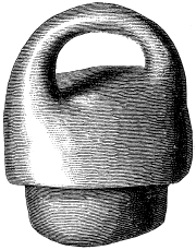 Наконец, из различных глиняных предметов из третьего, сожженного города я воспроизвожу на рис. 512 совок, лишь слегка обожженный, с отверстием в виде трилистника и небольшой ручкой; на рис. 513 – небольшую чашку из очень грубого материала, не отполированную и лишь слегка обожженную; чашка похожей формы, найденная в гробнице в Корнето, находится в Королевском музее в Берлине. Рис. 514 представляет собой крышку от вазы весьма замечательной и уникальной формы: она из массивной желтой глины, не отполирована и несет на себе следы сильного жара, воздействию которого она подверглась в пламени пожара. Ее нижняя часть вставлялась в вазу, как пробка, так что выдающаяся верхняя часть полностью закрывала горлышко и запирала его почти герметически весом крышки, который превышает 3 фунта. Похожую крышку вазы мы видели на рис. 304, однако у этой последней вся нижняя часть была полушаровидной формы и полая. Эти две крышки или пробки для ваз (рис. 304 и 514) находят себе аналогию в уже описанных крышках ваз, обнаруженных в Сихаломе в Венгрии и выставленных под № 26 и 27 в стеклянной витрине IX в Национальном музее Будапешта.