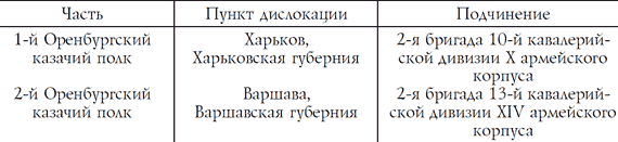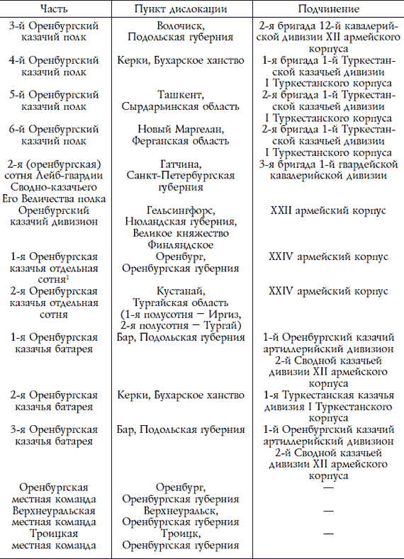 Как уже говорилось, войско было разделено на три военных отдела, каждый из которых, в свою очередь, делился на два полковых округа. Полковые округа являлись районами комплектования казачьих полков всех трех очередей. Из этого следует, что в каждом полковом округе формировалось три полка: один первоочередной и два льготных, следовательно, в каждом военном отделе формировалось шесть казачьих полков: два первоочередных и четыре льготных. На территории 1-го военного отдела формировались 2, 6, 7, 8, 13 и 14-й Оренбургские казачьи полки, на территории 2-го военного отдела – 1, 5, 9, 10, 15 и 16-й Оренбургские казачьи полки, на территории 3-го военного отдела – 3, 4, 11, 12, 17 и 18-й Оренбургские казачьи полки. Первоочередные казачьи части дислоцировались в Казанском, Киевском, Варшавском, Туркестанском и Петербургском военных округах. К 1914 г. дислокация и подчиненность оренбургских казачьих частей первой очереди иллюстрируются данными, приведенными в таблице 1.