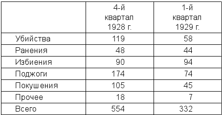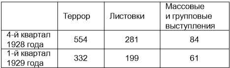Из 332 терактов, произошедших в 1-м квартале 1929 года, в январе было зарегистрировано 156, в феврале – 94, в марте (по неполным данным) – 72. Также снизилось число убийств: в январе – 33, в феврале – 14, а в марте – 11. По мнению чекистов, это было связано с жесткой карательной политикой, проводимой властями в отношении участников террора.