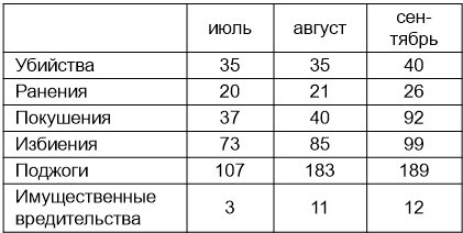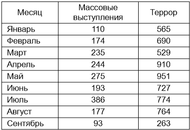 «Зарегистрировано по Союзу, кроме национальных районов, 1108 террористических актов, считая лишь убийства, ранения, покушения на убийства, поджоги и имущественное вредительство. Из месяца в месяц количество терактов возрастает: июль – 275, август – 375, сентябрь – 458. При этом нужно иметь в виду, что данные за сентябрь еще не окончательные и цифры эти могут быть увеличены»[62].