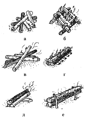 а – «шалаш»; б – «колодец»; в – «таежный»; г – из трех бревен («нодья»); д – «пушка»; е – из двух бревен.