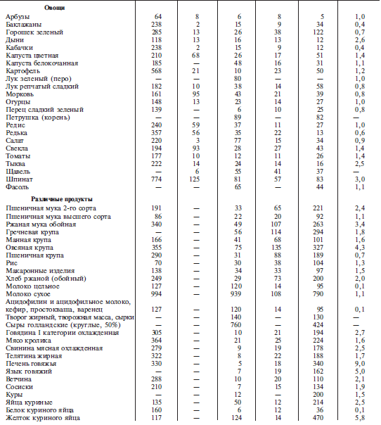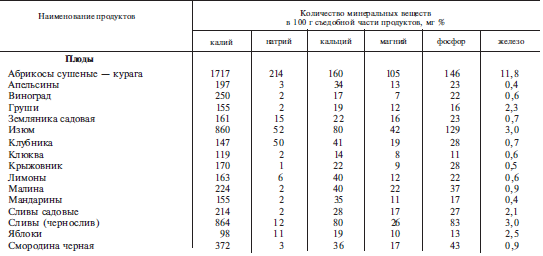 Наиболее богаты минеральными веществами плоды и овощи, но основным источником солей кальция и фосфора являются продукты животного происхождения, главным образом молоко и молочные продукты, особенно творог и сыры. Соли кальция в значительном количестве содержатся в фасоли, зеленом луке, петрушке, шпинате, салате, капусте, но кальций растительных продуктов усваивается организмом значительно хуже, так как часто связан со щавелевой кислотой, которая образует с ним нерастворимые соединения. Много фосфора содержится в сыре, твороге, мозгах, говяжьей печени, треске, сельди, крупах (гречневой, овсяной, пшенной), бобовых, богат им также ржаной хлеб из обойной муки и желток куриного яйца. Солями калия наиболее богаты овощи и плоды, особенно сушеные абрикосы (урюк, курага), изюм, чернослив, финики, инжир. Много его в картофеле, шпинате, редьке, фасоли.