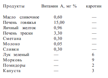 Витамин А необходим для роста организма, формирования костей, нормального состояния тканей кожи и слизистых оболочек. Одной из функций витамина А является обеспечение приспособления (адаптации) глаза к разной освещенности поля зрения. Минимальная суточная потребность взрослого человека в витамине А равна 1–2,5 мг. В активной форме витамин А содержится только в продуктах животного происхождения – печени многих рыб, сливочном масле (преимущественно летнем), сыре с высоким процентом жирности, желтках яиц, молоке и молочных продуктах и некоторых других. Рекомендуемая доза – 0,9 мг/день, содержится в 100 г тушеной моркови, 150 г тушеного шпината, 300 г сырых абрикосов. Рядом представлено количество (в мг %) витамина А и каротина в наиболее распространенных продуктах.
