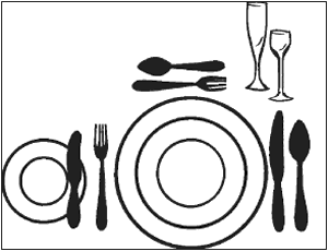 Справа обычно лежат ножи, обращенные лезвием к тарелке; слева – вилки, обращенные зубцами вверх. Суповая ложка кладется справа от внешнего ножа, а если десерта нет, то перед тарелкой. Если перед супом есть еще закуска, то соответствующий прибор, средний по размеру, кладется по краям уже положенных на стол приборов: нож – справа от суповой ложки, а соответствующая вилка – слева от тарелки с самого края. За суповой ложкой кладут, если необходимо, рыбный прибор, а непосредственно у тарелки – большой прибор для мясного блюда.