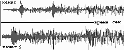 Упомянем о хорошо известном всем стереофоническом эффекте, позволяющем синхронно воспроизводить из двух различных динамиков различный звук. Как известно, формат моно связан с записью в аудиофайл одной звуковой дорожки, а формат стерео – двух (в последнем случае размер файла по сравнению с монофоническим удваивается благодаря записи в один аудиофайл двух зависимостей интенсивности звука от времени – пример показан на рис. 1.12).