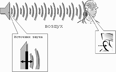 В результате колебания передаются по воздуху на расстояние, т. е. в воздухе распространяется звуковая или акустическая волна, или, попросту, звук. Звук, достигая уха человека, в свою очередь, возбуждает колебания его чувствительных участков, которые воспринимаются нами в виде речи, музыки, шума и т. д. (в зависимости от свойств звука, продиктованных характером его источника).