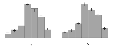 Поясним сказанное на простом примере (рис. 1.11). Рассмотрим малый интервал времени, для которого имеется несколько измеренных значений интенсивности (для определенных отсчетов времени с равными промежутками). Эти значения интенсивности обозначены на рисунке крестиками. Если использовать высокую глубину кодировки, то при помощи достаточного числа бит информации можно записать в звуковой файл данные значения интенсивности с большой точностью (столбики на рис. 1.11, б). Однако, в целях уменьшения размера файла, глубина кодировки может быть уменьшена. Это означает, что имеющееся в распоряжении компьютера число бит информации будет недостаточным, чтобы записать точные значения интенсивности, а вместо них в файл будут записаны наиболее близкие допустимые значения (столбики на рис. 1.11, а). Разумеется, из-за отличий в исходном звуковом сигнале и записанной в аудиофайл информации качество воспроизведения звука во втором случае будет гораздо худшим. Подчеркнем, что в обоих случаях использовалось одинаковое значение частоты дискретизации.