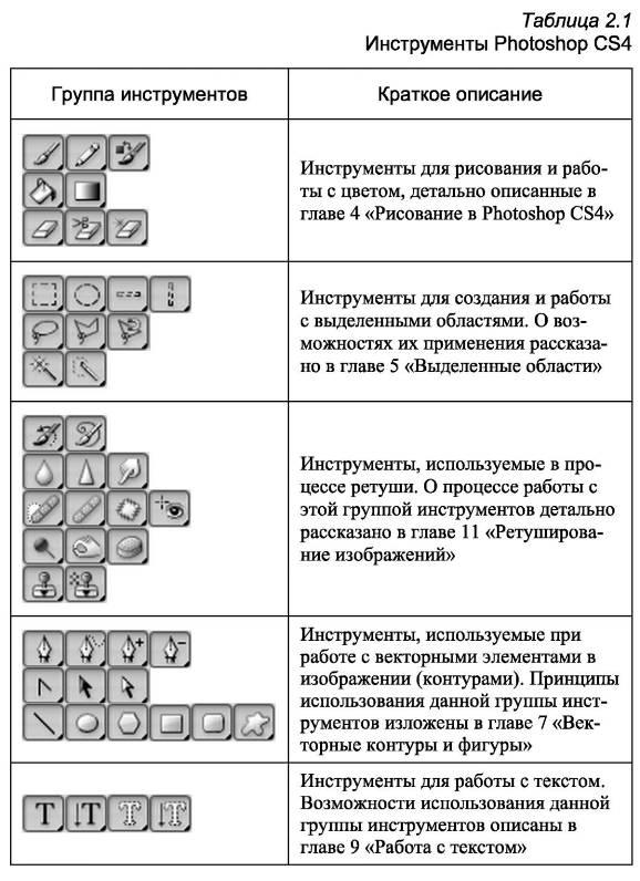 Ниже приводится полный перечень всех инструментов Photoshop CS4 и краткое описание области их применения (табл. 2.1). Более подробно инструменты будут рассмотрены далее.