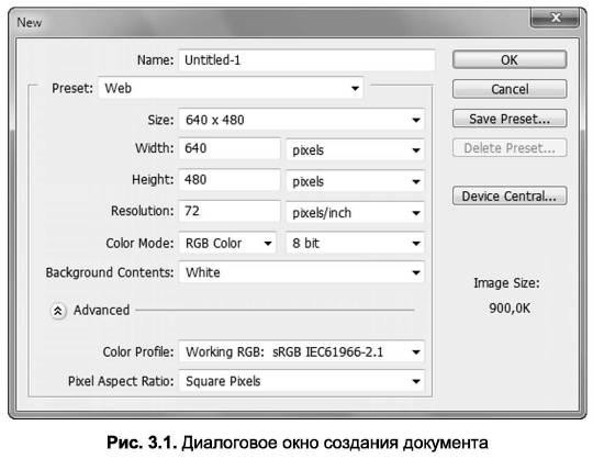 Для создаваемого документа необходимо также указать: размеры изображения {Width, Height), разрешение (Resolution), цветовую модель {Color Mode), глубину цвета, фон {Background Contents) (белый, прозрачный или фоновый цвет, выбранный на панели Tools {Инструменты)), а также цветовой профиль {Color Profile) и вид пикселей {Pixel Aspect Ratio) (см. рис. 3.1).