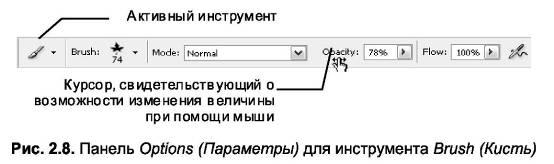 На панели Options (Параметры) в верхней части рабочего окна Photoshop расположены настройки текущего инструмента (рис. 2.8). Панель можно перемещать в рабочей области приложения или закрепить в верхней или нижней его части. Скрыть или отобразить панель можно командой Window (Окно) \ Options (Параметры). Вид панели зависит от выбранного инструмента.