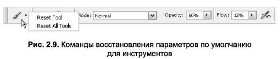 При необходимости можно вернуться к настройкам по умолчанию для инструментов, используя команды контекстного меню, открываемого по щелчку правой кнопки мыши на иконке инструмента панели Options (Параметры) (рис. 2.9):