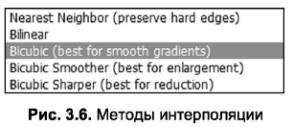 Рядом с флажком Resample Image (Изменять размер изображения) расположен раскрывающийся список, предназначенный для выбора метода интерполяции. Каждый из предлагаемых методов имеет свои особенности и предназначен для разных типов изображений (рис. 3.6):