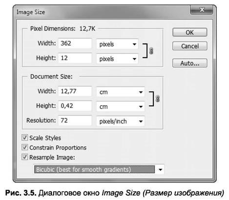 Чтобы изменить размер или разрешение изображения, открытого в Photoshop, нужно выполнить команду Image (Изображение) | Image Size (Размер изображения). Диалоговое окно Image Size (Размер изображения) показано на рис. 3.5.