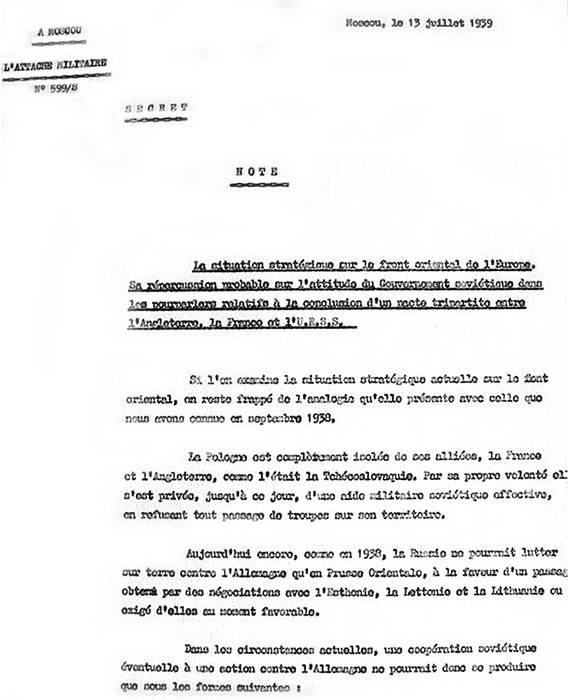 Нота от 13 июля 1939 г., адресованная военным атташе посольства Франции в СССР в Министерство иностранных дел Франции
