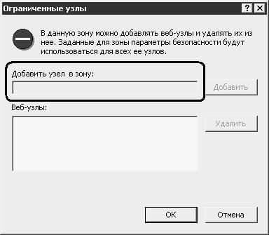 С помощью параметра SecAddSites типа DWORD, который создается в разделе реестра HKEY_CURRENT_USER\Software\Policies\Microsoft\Internet Explorer\Control Panel, можно запретить добавление веб–узлов под кнопкой Узлы – для этого данному параметру нужно присвоить значение 1; при этом текст reg–файла будет следующим: