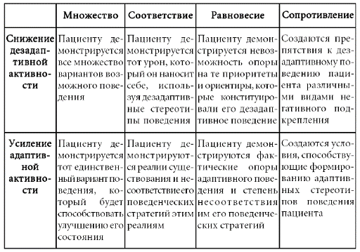 Таковы четыре универсальные формулы, используемые КМ СПП; они представляют собой формально-логические образования, призванные сориентировать и направить работу психотерапевта. Фактически психотерапевту надлежит создать условия для снижения активности пациента, направленной на поддержание дезадаптивных форм поведения, и усилить активность пациента в направлении создания и использования таких стереотипов поведения, которые способствовали бы субъективному улучшению его качества жизни. Разумеется, в деле создания этих условий целесообразно использовать указанные универсальные формулы, то есть изменяя, в соответствии с задачей, позиции множества, соответствия, равновесия и сопротивления. Направления этой работы представлены в таблице:
