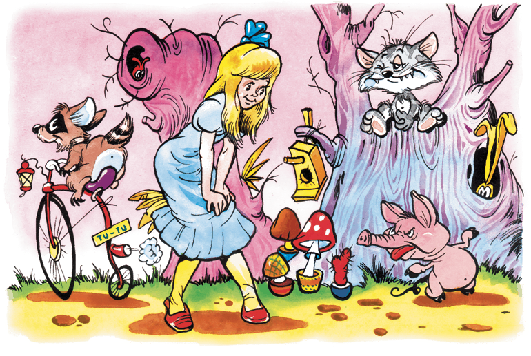 И тут он опять хрюкнул! Да ещё во весь голос! И завизжал по-поросячьи. Алиса так и ахнула – у неё в руках был действительно поросёнок! Алиса представила, какой у неё глупый вид с поросёнком на руках. И опустила его на землю. Поросёнок, быстро перебирая ножками, исчез в лесу.