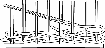 а) концы расположены с лицевой стороны основы друг над другом и торчат в разные стороны. Следующими рядами они будут плотно прижаты, поэтому их можно будет ножом аккуратно обрезать;