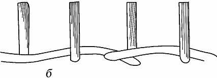 Плетение начинают комлевым концом прута, который вставляют между стояками. Сначала оплетают второй стояк снаружи, третий стояк оплетают изнутри, четвертый оплетают снаружи и т.д. Это плетение напоминает простое, однако направлять прут нужно вверх по диагонали под углом 10 – 15 градусов. Чем больше наклон и количество прутьев, тем выше получится слой плетения.