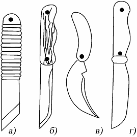 Основным инструментом мастера является нож. Существуют много разновидностей ножей для изготовления мебели из лозы. На рисунке а показан основной рабочий нож, который служит для обрезания торчащих концов, для обрезания заготовленных прутьев, раскалывания прутьев и др. Черновой нож (рис. б) сделан из более мягкой стали и предназначен для черновых работ. Для срезания прутьев применяют серповидный нож (рис. в). Для обрезания кончиков прутьев и для строгания стояков можно воспользоваться ножом корзиночным (рис. г).