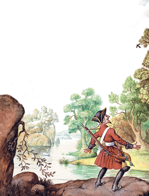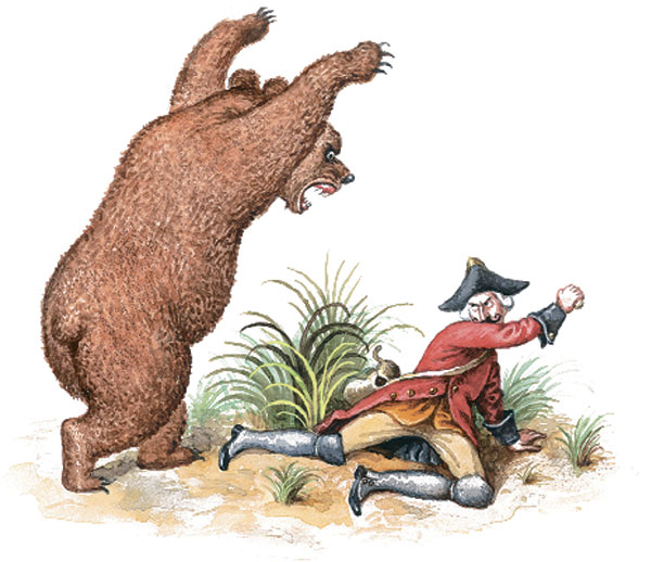 Как-то раз в Польше я охотился на птиц. Охота была удачная, и зарядов не осталось. Вечерело. Я стал собираться домой, как вдруг, откуда ни возьмись, громадный медведь – идёт прямо на меня, широко раскрыв страшную пасть. Напрасно я шарил по карманам – там, кроме двух запасных кремней, ничего не оказалось. Схватив один, что было силы я бросил в открытую пасть зверя и угодил в самую глотку. Мишка заревел, опустился на все четыре лапы и повернулся ко мне задом. В тот же миг я всадил в него другой кремень. И произошло нечто необычное: от удара кремней посыпались искры, раздался оглушительный треск, и медведя разорвало.