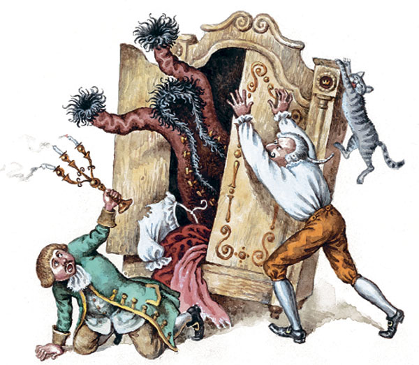 В ту минуту, как я вошёл в гардеробную, мне представилась такая картина: взбесившийся сюртук, покусанный бешеной собакой, трепал и рвал моё парадное платье. Мы со слугой с трудом привели всё в порядок.