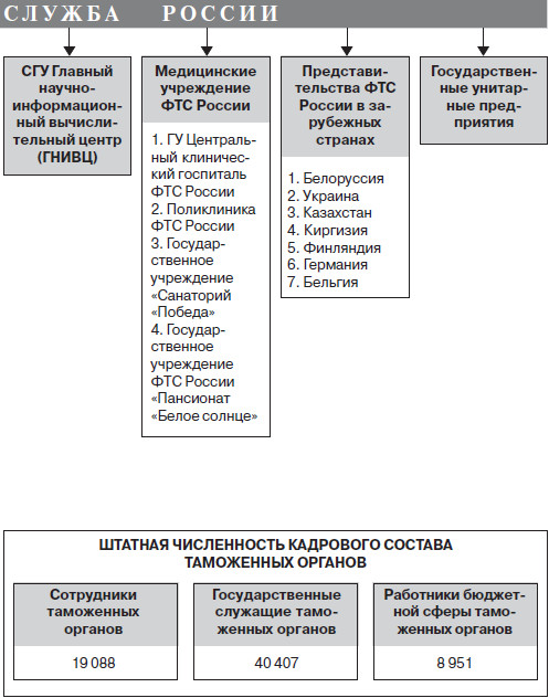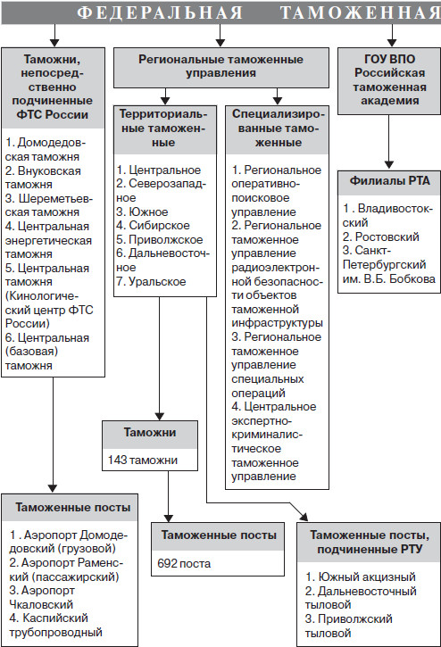 Структура таможенных органов РФ и организаций ФТС России приведена на рис. 2 (см. стр. 26–27). Центральным органом, осуществляющим непосредственное руководство таможенным делом в Российской Федерации, является федеральный орган исполнительной власти, уполномоченный в области таможенного дела, – Федеральная таможенная служба России. В его ведении находятся основные составные части, блоки и участки таможенного дела, которыми он руководит через соответствующие управления, отделы, службы, иные структурные подразделения своего аппарата, а также через региональные таможенные управления, таможни, таможенные посты.