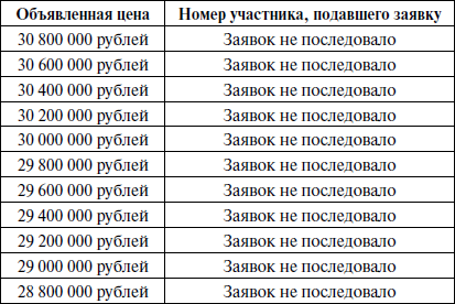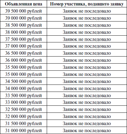 При отсутствии заявок распорядитель торгов объявил об уменьшении шага торгов до 500 000 рублей, после чего в отсутствие заявок от участников торгов пошагово уменьшал цену лота до 31 000 000 рублей.