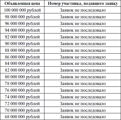 При отсутствии заявок распорядитель торгов объявил об уменьшении шага торгов до 2 000 000 рублей, после чего в отсутствие заявок от участников торгов пошагово уменьшал цену лота до 60 000 000 рублей.