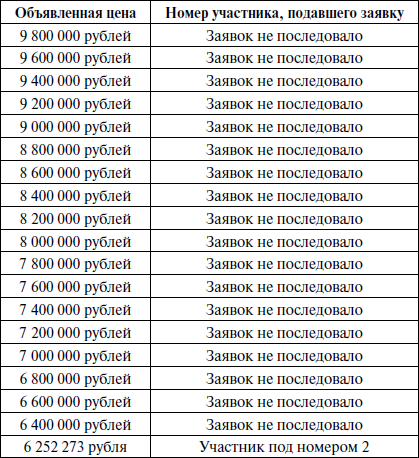 При отсутствии заявок распорядитель торгов объявил об уменьшении шага торгов до 200 ООО рублей, после чего в отсутствие заявок от участников торгов пошагово уменьшал цену лота до 6 252 273 рублей.