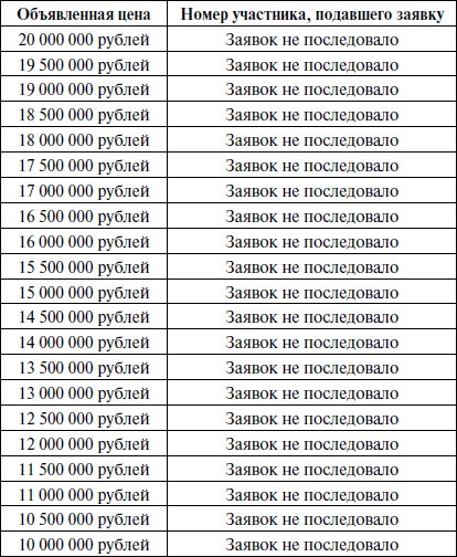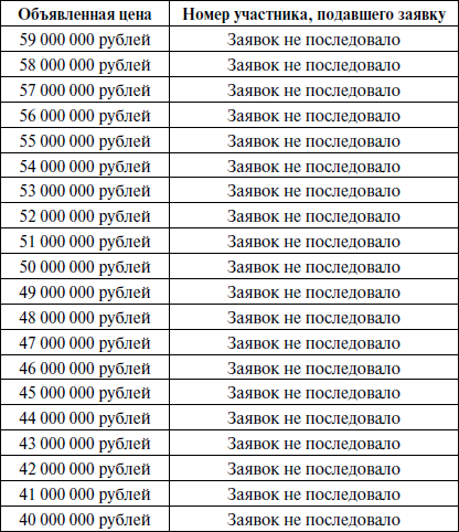 При отсутствии заявок распорядитель торгов объявил об уменьшении шага торгов до 1 000 000 рублей, после чего в отсутствие заявок от участников торгов пошагово уменьшал цену лота до 40 000 000 рублей.
