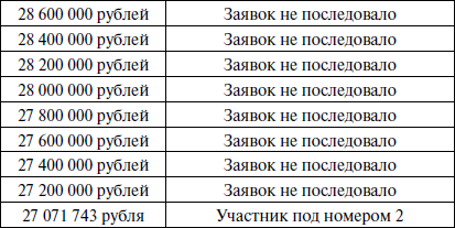 При отсутствии заявок распорядитель торгов объявил об уменьшении шага торгов до 200 000 рублей, после чего в отсутствие заявок от участников торгов пошагово уменьшал цену лота до 27 071743 рублей.